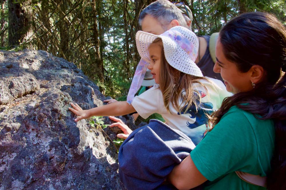 Our educational journey began even before we made it to the trailhead. We stopped several times on the way up Dead Indian Memorial and Shale City Road to observe signs of a tumultuous past. Across from a dacite quarry, we stopped to inspect large blocks of lava rock dotting a grassy field. These boulders were brought there long ago by a landslide that extends approximately five miles to the skyline ridge.
