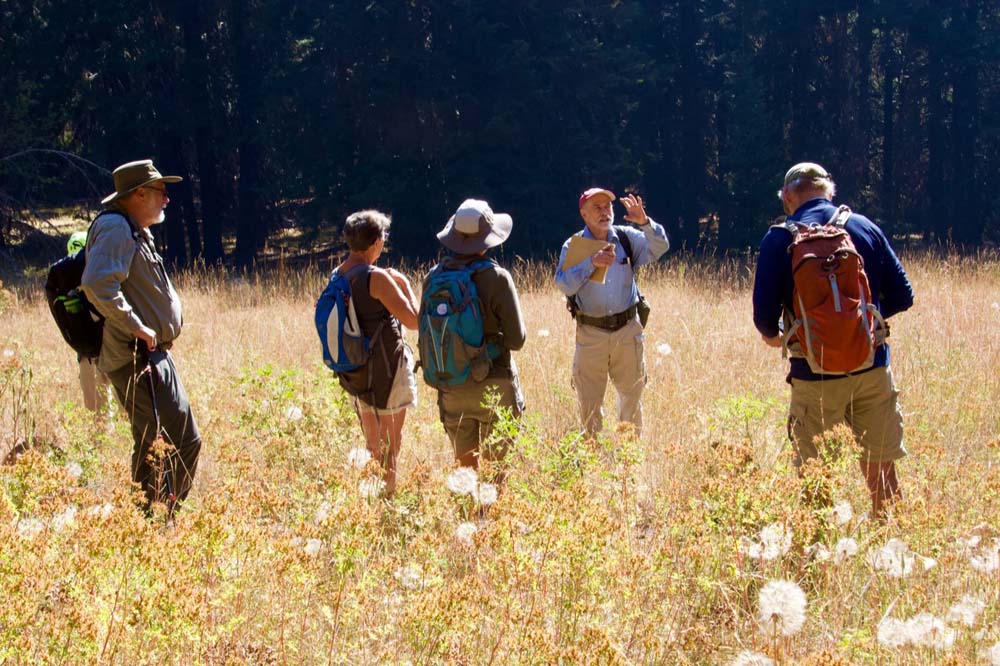 Geologist Jad D’Allura, SOU professor emeritus (with red hat, right center), shows Hike and Learn group the summit of Grizzly Peak. Heather Wilson photo