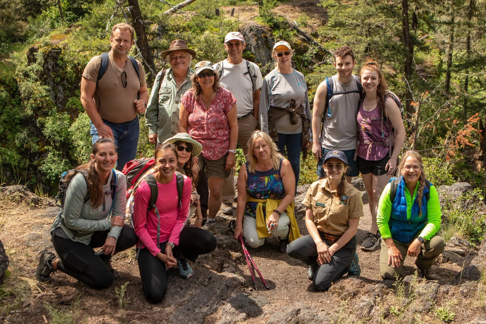 When we finally came to a stop and opened the doors, we were greeted by the earthy scent of the forest floor accompanied by the fresh water that trickled in the creek. The area was stunning, and the chirping birds sang as we gathered our group to begin the hike to Lost Creek Falls. Starting in we found a small single file trail winding through the open forest. Following the trail we found many native flowers, some of which were rare species to find. This prompted a conversation about the origin of the Monument. How in 2000 former President Bill Clinton used the Antiquities Act to conserve and preserve this area of land because of its expansive biodiversity. We continued to hike, thinking about what this meant, and beginning to see for ourselves the rich mosaic of plant and animal life living and thriving in the very place we walked. The canopy began to tighten, allowing only a few streams of sunlight through to the forest floor. Not long after the dense forest started, we began to encounter large fallen trees across our path. It was amazing to see the smiles everyone bore as they traversed the terrain, sensing the wilderness of the place and becoming enchanted by it. Soon, the canopy cover reopened, and rocky outcroppings emerged in the distance. The sound of the creek had grown so gradually, one could almost miss the change.
