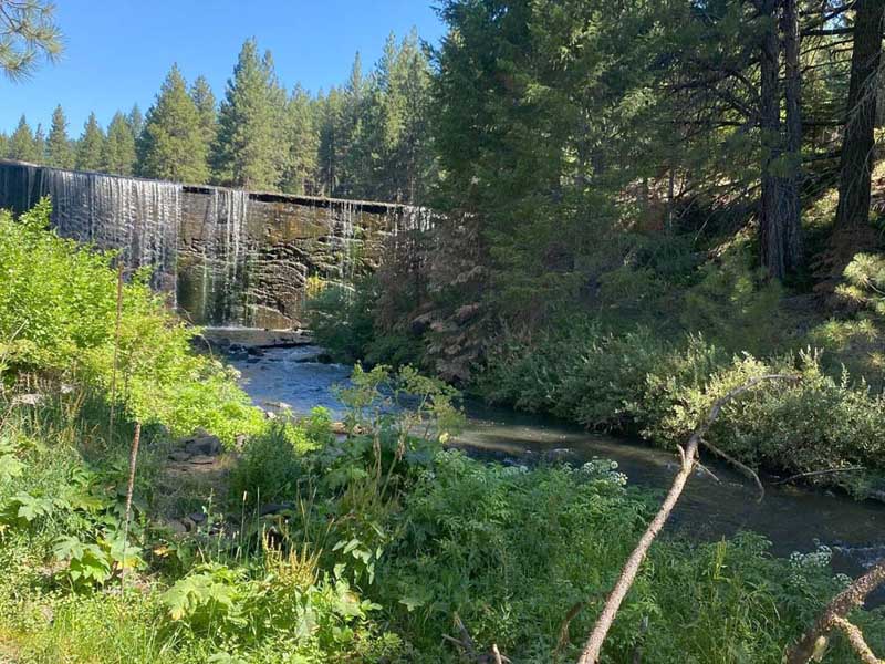 Approaching the trail’s end, the pleasant sound of rushing water reached our ears, beckoning us closer even before it came into view. Emerging from the forest’s embrace, we encountered a gravel road that led us towards an intriguing sight – a weathered and time-worn dark barrier. Atop this barrier, crystal clear water flowed gracefully, sparkling as it descended into the tranquil flow of Keene Creek.