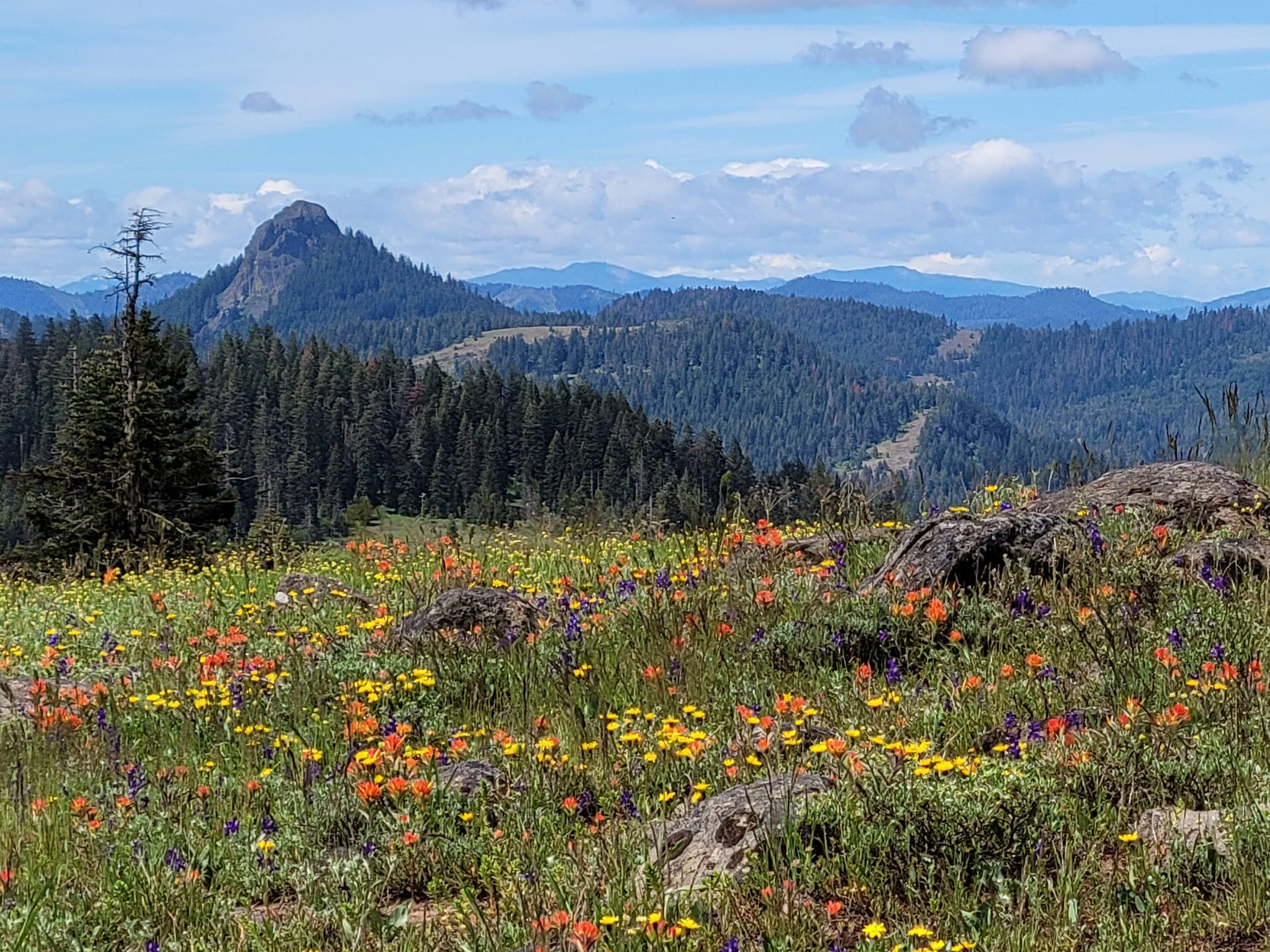The diverse topography of this region sets the stage for an inspiring assemblage of plant communities within the area. Along the trail, we moved through an old-growth conifer forest of Grand and White Fir trees, a series of wet meadows, and up to a rocky, shrubby grassland atop the plateau, exposed and slowly regenerating from the 2002 Antelope fire. With such a variety of slope, aspect, moisture, light, and elevation, we identified around 50 species of flowering plants, shrubs, and trees on this 5-mile loop!