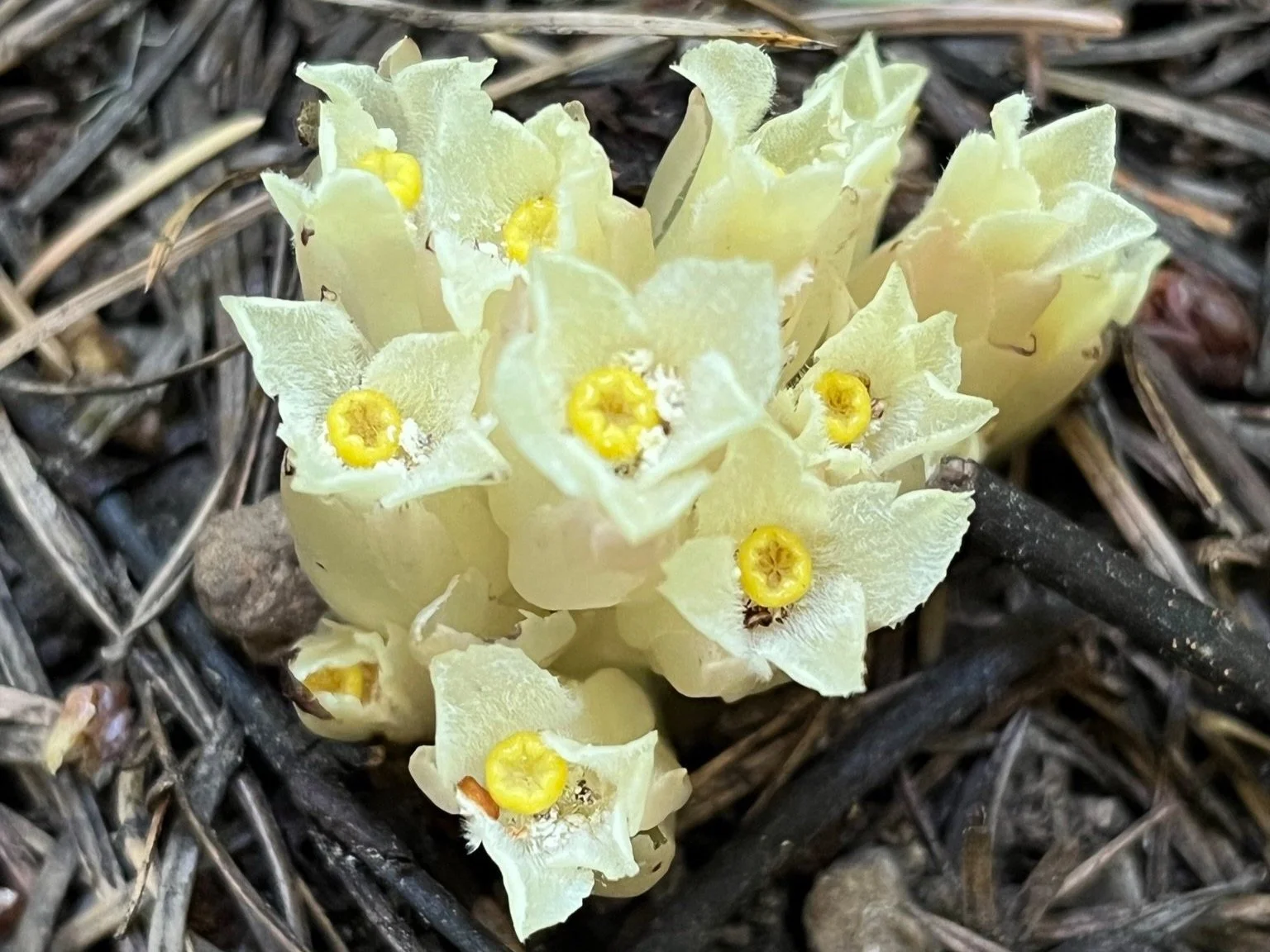 The botanical excitement continued as we walked through a more forested section of the PCT with big old conifers shading the trail. Two rare species of mycotrophic plants were in bloom: Phantom orchid (Cephalanthera austiniae) and Gnome plant (Hemitomes congestum)! These species do not make their own chlorophyl, lacking the green color typical of Kingdom Plantae. On the hike, we called them “saprophytic” plants. According to the U.S. Forest Service, this term misses the mark. These plants don’t get carbon nutrients from decaying organic matter (saprophytic), but are instead engaged in a symbiotic relationship with the soil fungi living in and around root systems of the trees and plants of the forest. See this awesome article for more info: https://www.fs.fed.us/wildflowers/beauty/mycotrophic/whatarethey.shtml.