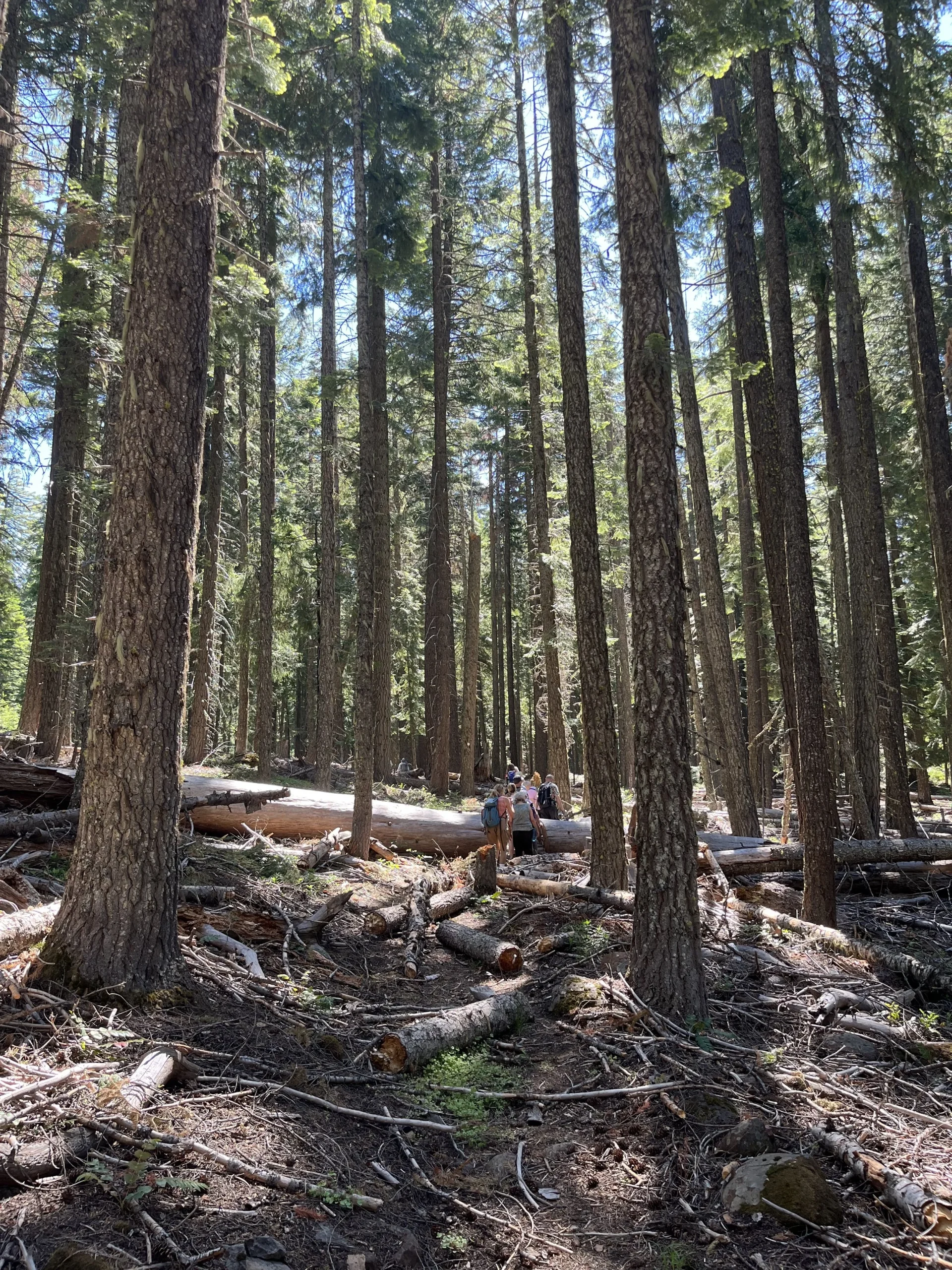What makes a forest “old growth”? Steve tells us that the woods in our area are considered old growth if there have been no major unnatural changes (logging) for 80-100 years. We certainly walked past trees that have been alive for more than 100 years, but the stands we walked through were mostly second growth; the area had been logged in the past, like much of the forests of Oregon. Despite this disturbance, the forest has regenerated, and is now protected. Enormous Sugar Pines, Ponderosa Pines, and Douglas-firs towered above us, with Incense Cedar and White Fir filling in the gaps. Wind, especially during snowstorms, is now the main disturbance characterizing these woods. The presence of dead and downed limbs and trunks surrounding and even crossing the trail was astounding!