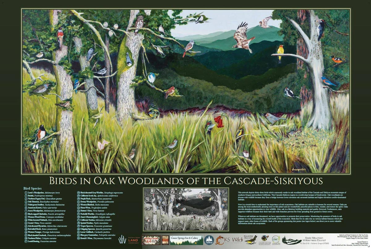 This poster depicts 33 birds common to the oak woodland habitat of the Cascade and Siskiyou mountain ranges of southern Oregon and northern California. The Cascade-Siskiyou region is a global hotspot of biodiversity. Oak woodlands are diverse with wildlife because they form a bridge between lower elevation oak savannah habitats and higher elevation conifer-dominated habitats.