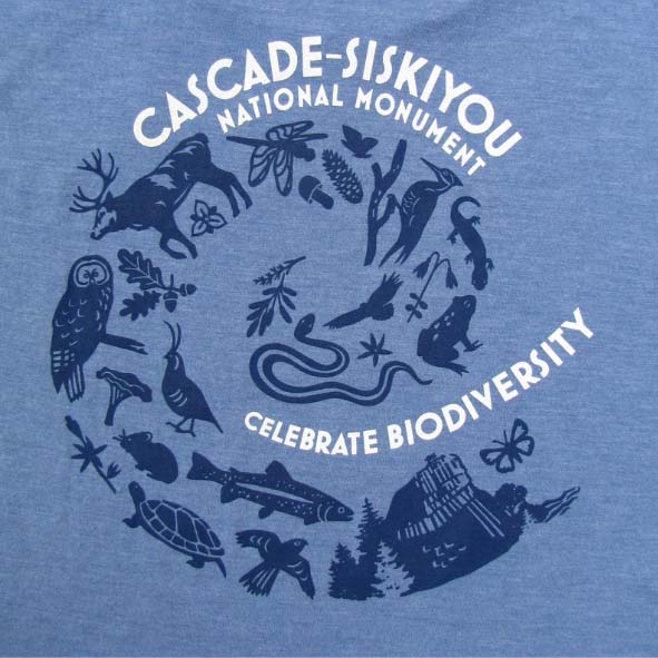 Original design highlights the extraordinary biodiversity within the Cascade-Siskiyou National Monument. T-shirt features a small “Friends” logo on front left and the large design on back. Available in unisex and women’s style.